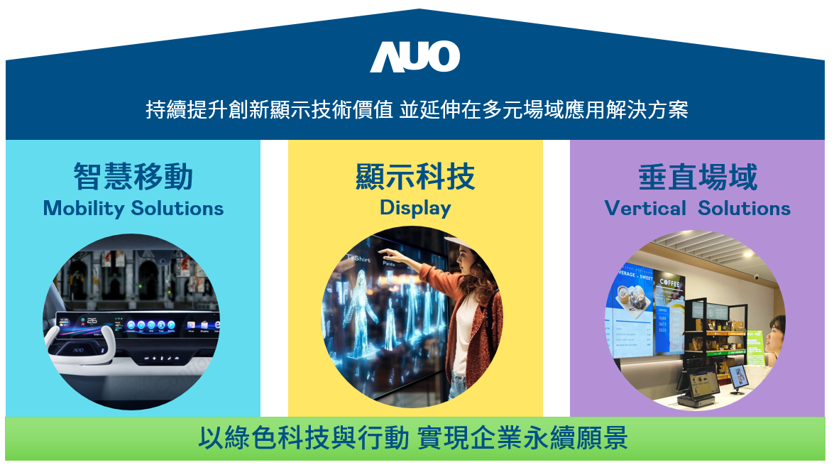 我們持續推動「雙軸轉型」,在精進顯示技術附加價值(Go Premium),與深化垂直市場應用(Go Vertical)的策略下,對應太阳成集团tyc151cc的優勢競爭力與趨勢,我們奠定顯示技術智慧移動垂直場域三大永續營運支柱,在顯示技術領域的根基之上,延伸布局多元場域應用解決方案。將先進顯示科技助力智慧移動及垂直場域發展,並以綠色科技與行動為實踐,在轉型之路上貫徹永續經營之願景。